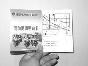 為方便農(nóng)民進(jìn)城經(jīng)營(yíng)和維護(hù)城市良好的衛(wèi)生狀況,城管執(zhí)法大隊(duì)經(jīng)過走訪流動(dòng)商販、向其征求意見,規(guī)范了流動(dòng)商販的銷售地點(diǎn),制作了這張“明白卡”,使商販清楚自己在哪里經(jīng)營(yíng)合法,在哪里經(jīng)營(yíng)不合法。商販只要按照“明白卡”上的提示,自覺到指定的街道位置經(jīng)營(yíng),并保持經(jīng)營(yíng)場(chǎng)地干凈衛(wèi)生即可放心經(jīng)營(yíng)。這樣也減少了經(jīng)營(yíng)者與城管執(zhí)法人員的磨擦。這種親民理念不但受到廣大市民的歡迎,也讓商販們大加稱贊。