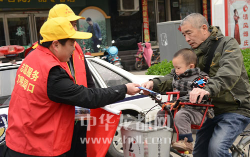 志愿者在交通路口執勤,并向過往行人發放文明交通宣傳單。
