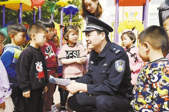 5月10日,扶溝縣公安局汴崗派出所民警走進轄區幼兒園,向小朋友介紹地震逃生技巧、火災預防措施和火災報警常識等,提高了小朋友應急自救互救能力。 記者 謝永靜 通訊員 李龍喜 攝
