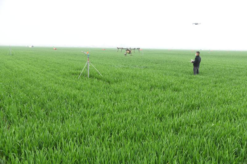 圖為商水縣高標準農(nóng)田示范區(qū)內(nèi),技術人員在操作植保無人機噴灑農(nóng)藥。