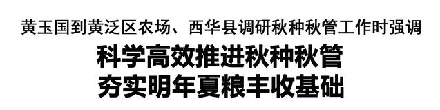 本報訊 (記者 王艷) 11月11日,市委書記黃玉國到黃泛區農場、西華縣調研秋種秋管工作。他強調,要深入學習貫徹習近平總書記關于“三農”工作的重要論述和在河南考察時重要講話精神,堅決扛穩扛牢糧食安全責任,科學高效推進秋種和田間管理,確保種足種好小麥,為明年夏糧豐收奠定堅實基礎。