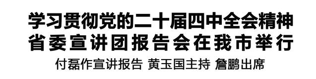 本報訊(記者 王艷 王晨) 按照省委統一部署,11月24日,學習貫徹黨的二十屆四中全會精神省委宣講團報告會在我市舉行。省委宣講團成員,省交通運輸廳黨組書記、廳長付磊作宣講報告。市委書記黃玉國主持報告會,市長詹鵬出席。