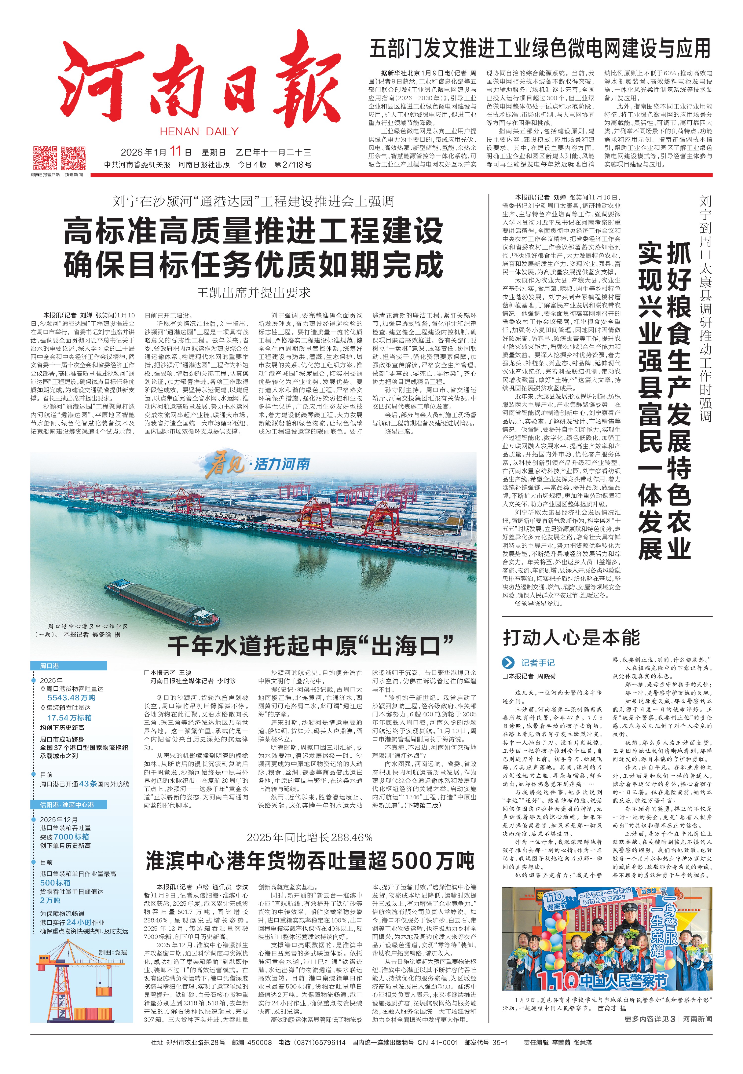 漯河港、平頂山港相繼開港運營;周口港中心港區中心作業區一期工程去年年底建成投用,標志著河南內河集裝箱運輸邁入“百萬標箱時代”;沙潁河“通港達園”工程開工建設,進一步完善我省水運網絡,服務和融入新發展格局。