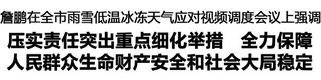 本報訊 (記者 李鳳霞) 1月18日,市長詹鵬主持召開全市雨雪低溫冰凍天氣應對視頻調度會議,強調要深入學習貫徹習近平總書記關于防災減災救災的重要指示精神,貫徹落實省委和市委決策部署,以“時時放心不下”的責任感,扎實有效應對雨雪低溫冰凍天氣,確保人民群眾生命財產安全和社會大局和諧穩定。孔陽、朱向陽、張建黨、程若光、王文峰出席會議。