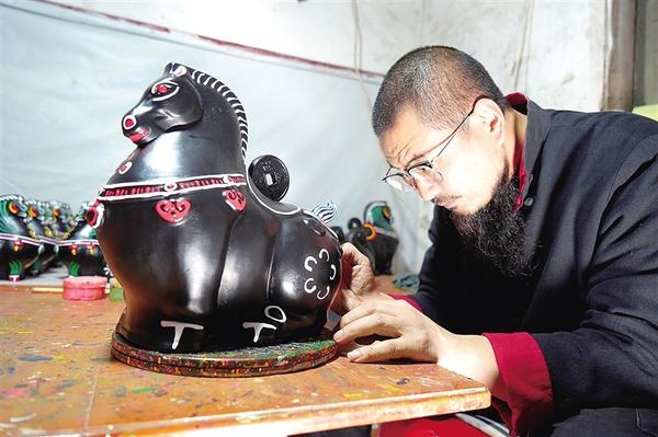 該日上午,邵波與妻子劉保青及工匠們正加緊趕制馬年系列作品《馬上有財》。與傳統泥泥狗古樸神秘的風格不同,這組馬年作品呈現出明顯的“萌寵化”特征。