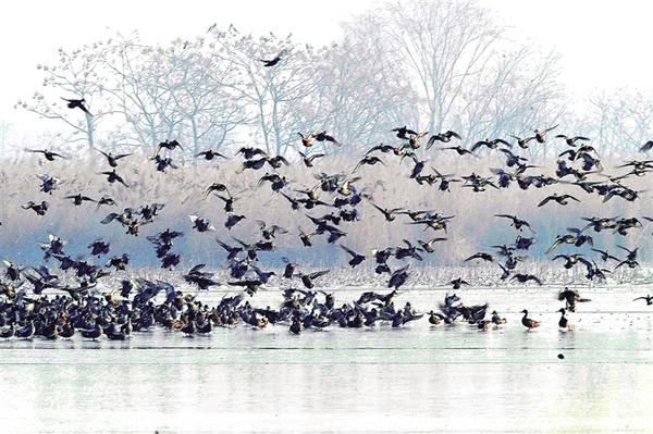 近日,近千只野鴨齊聚淮陽(yáng)龍湖國(guó)家濕地公園,或翩躚起舞或嬉戲游弋,構(gòu)成一幅靈動(dòng)的冬日生態(tài)畫卷。