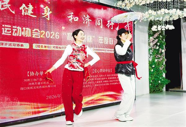 健步走愛好者展示自編自演的健身操。近日,周口市健步走協會年會在周口中心城區世紀星酒店舉行,50多支健步隊、數百名愛好者齊聚一堂,共迎新春、共話健康。記者 徐啟峰 攝影