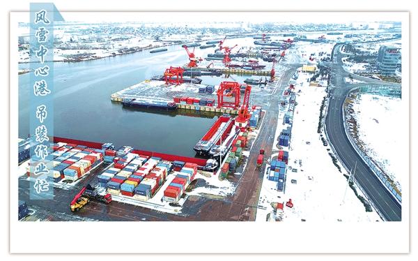 1月21日上午,白雪裝點下的周口中心港范營作業區一片繁忙景象。碼頭上,運輸車輛往來穿梭,集裝箱吊裝作業有序進行,呈現了新年伊始港口生產的蓬勃氣象。