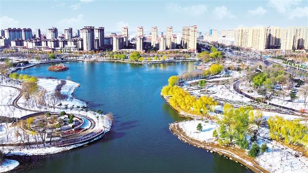 12月13日,扶溝縣人民公園白雪皚皚、天藍水清、柳樹正黃,與遠處聳立的高樓,共同構成一幅絕美畫卷,成為市民休閑散步的好去處。