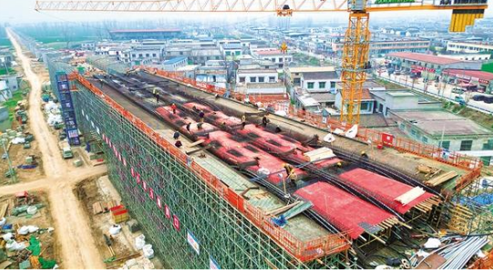 3月14日上午,中鐵十局工人在平漯周高鐵9標段工地上開展岔道連續梁施工。