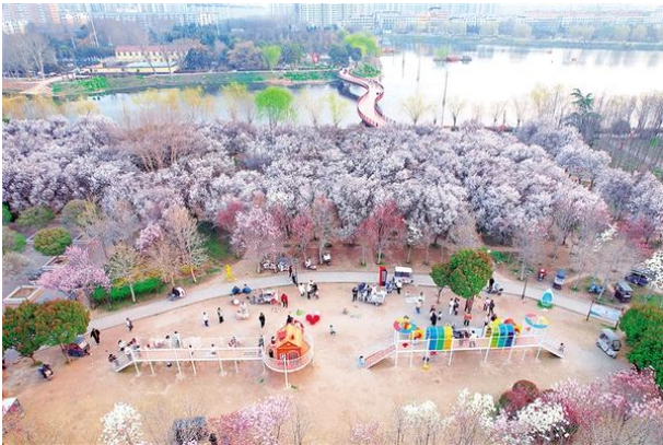 3月16日,項城市人民公園樹木蔥郁、色彩斑斕,綠植、觀景步道、湖水、民居相映成景,宛如一幅多彩的春日生態畫卷。