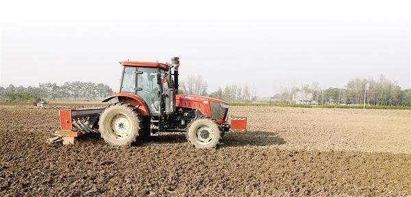 11月9日,在淮陽區高標準農田示范區,一臺東方紅拖拉機牽引著復式播種機在地里穿梭。