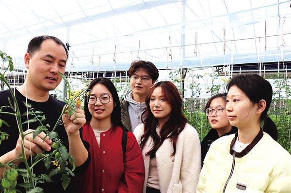12月7日,扶溝蔬菜研究院的技術(shù)員向河南農(nóng)業(yè)大學(xué)園藝學(xué)院的學(xué)生傳授番茄管理技術(shù)。