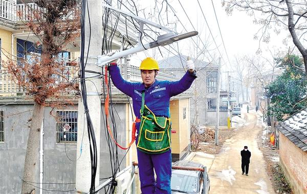 近日,鄲城縣宜路鎮劉老莊村民劉中新在村口安裝路燈。